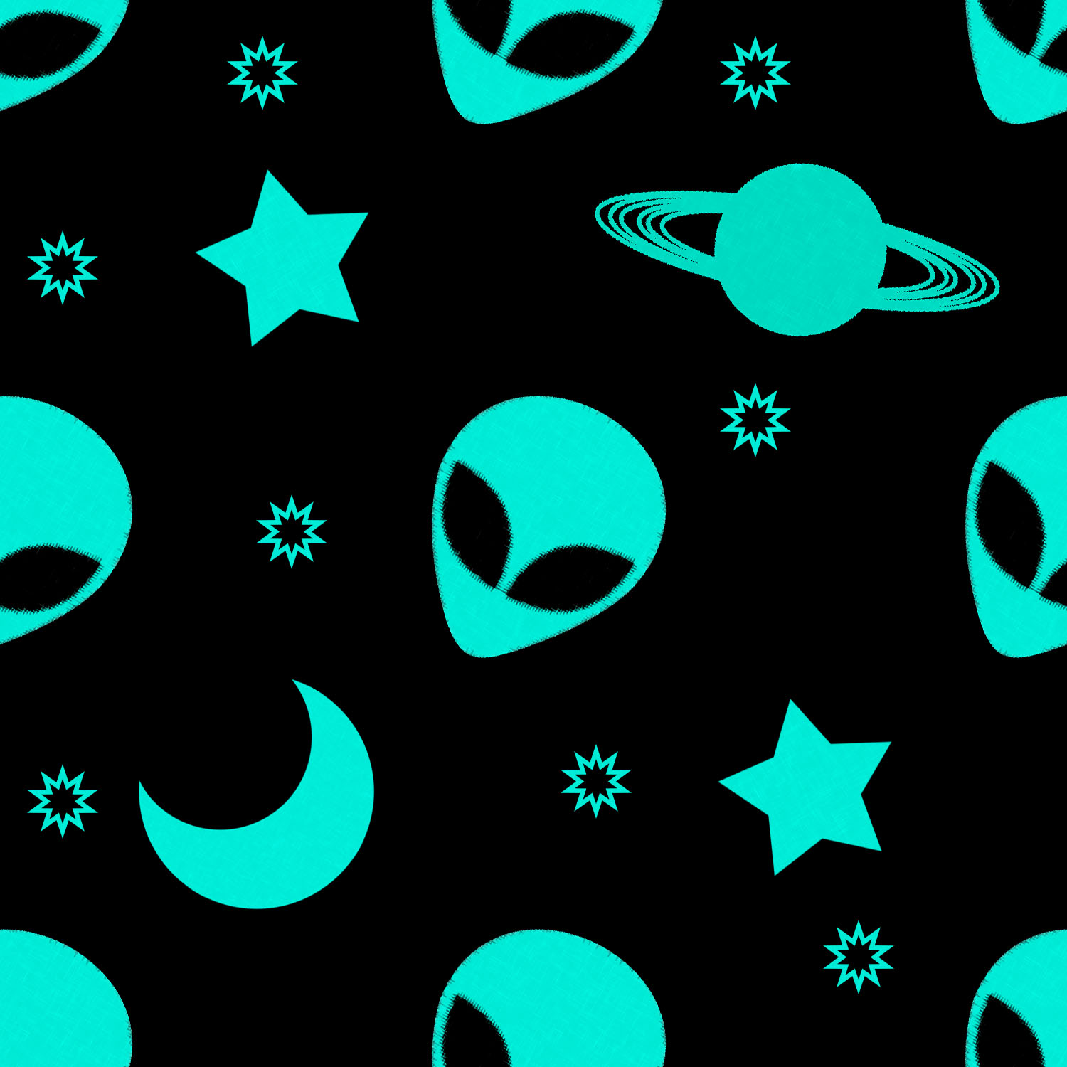 Bright turquoise alien heads, stars, crescent moons, and a ringed planet scatter across a stark black background, forming a playful cosmic pattern.