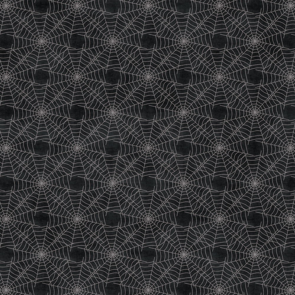 Delicate gray spiderwebs interlock in a seamless geometric pattern across a textured black background, creating an intricate and eerie design.