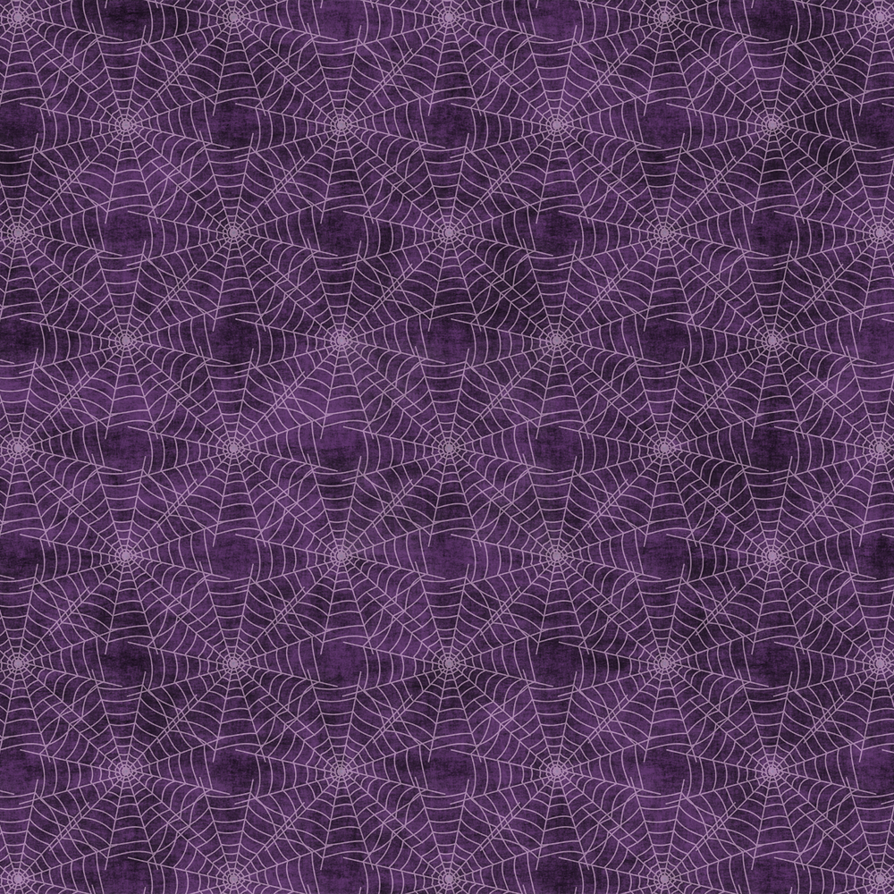 Intricate pale spiderwebs radiate across a deep textured purple background, forming a seamless and hauntingly elegant pattern.