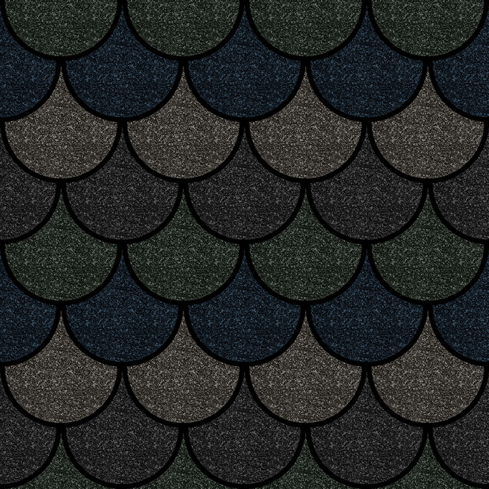 Overlapping scalloped scales in textured shades of green, blue, gray, and black form a shimmering, fish-like pattern outlined in bold black lines.