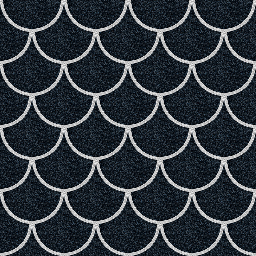 A shimmering pattern of dark navy scalloped scales is outlined in glittering silver, creating a sleek, fish-like texture with a metallic finish.