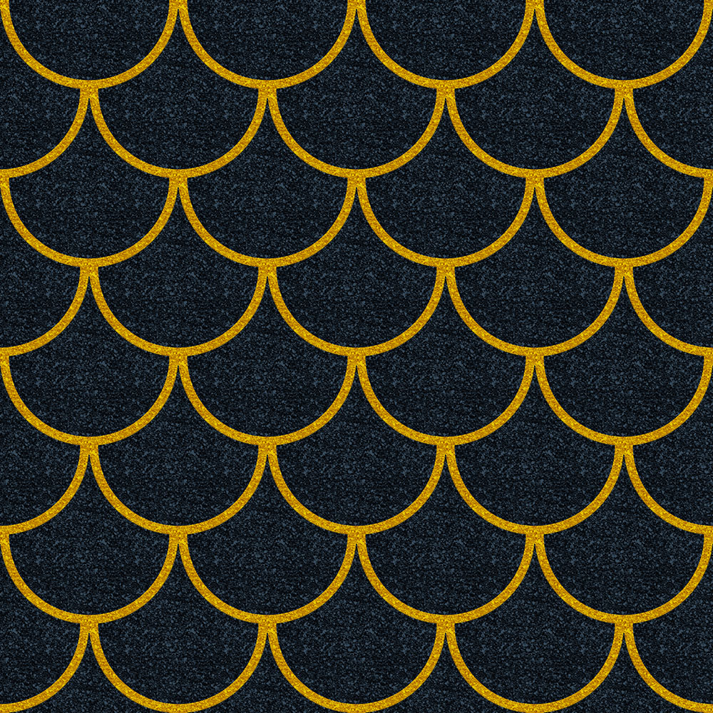 A dark navy scalloped scale pattern is outlined in glittering gold, creating a luxurious, fish-like texture with a shimmering metallic effect.
