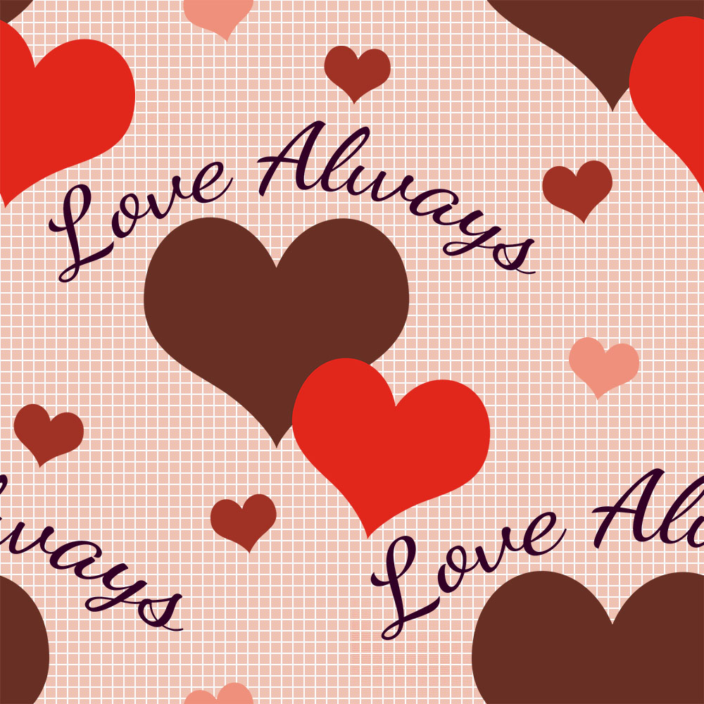Red and brown hearts of varying sizes scatter across a pink grid background, interwoven with the cursive phrase “Love Always” in deep purple script.