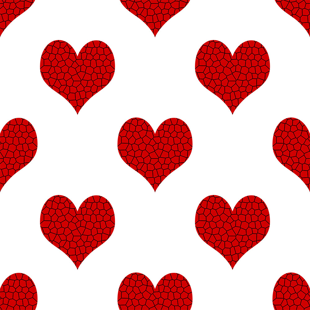 Bright red mosaic-textured hearts are evenly spaced across a crisp white background, forming a bold and playful repeating pattern.
