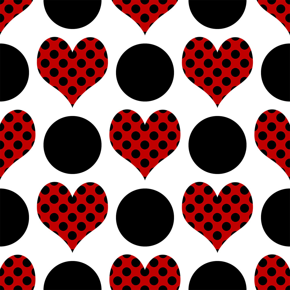 Bold black circles alternate with red hearts patterned in black polka dots, creating a striking geometric design against a white background.