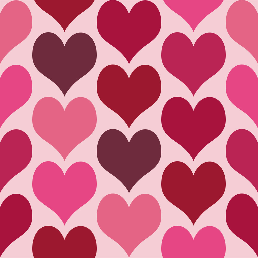 Rows of overlapping hearts in shades of pink, red, and burgundy form a seamless repeating pattern against a soft pastel pink background.