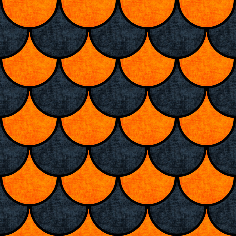 A bold scalloped scale pattern alternates between textured orange and charcoal segments, outlined in black to create a striking, fiery design.