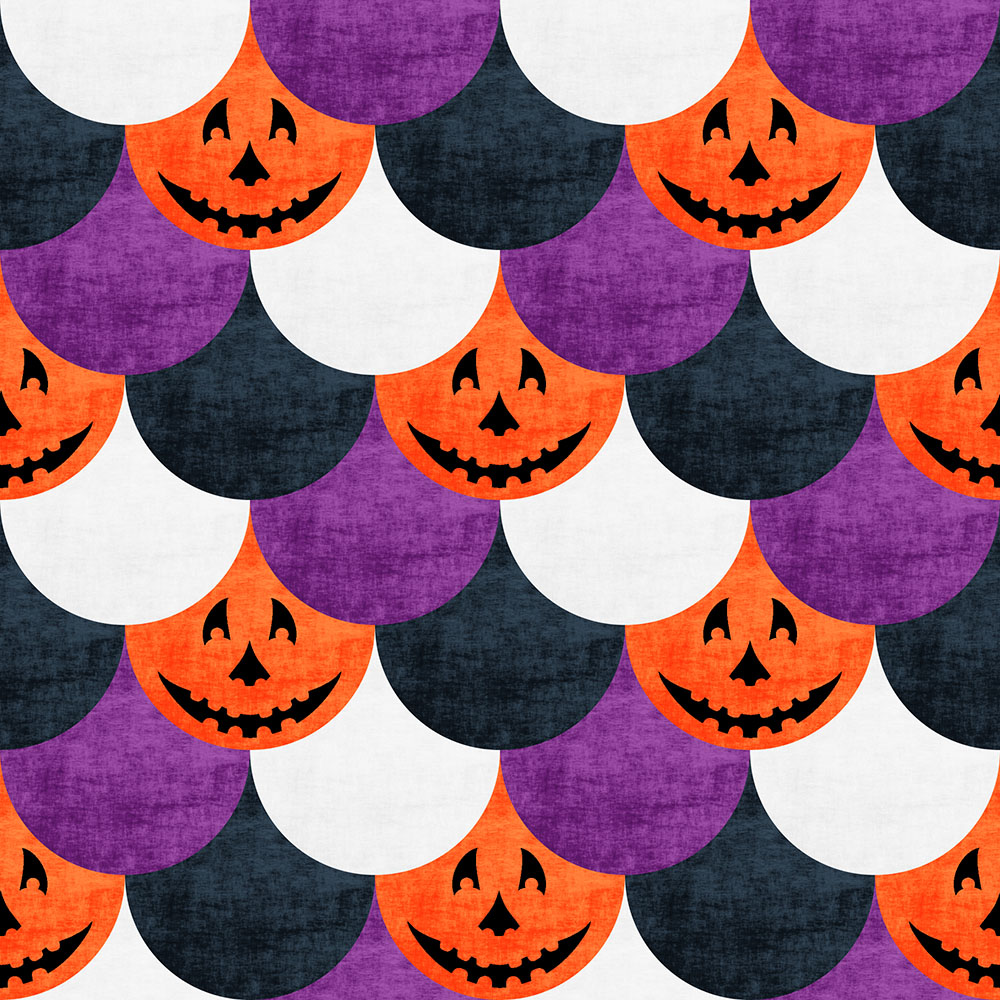 A playful scalloped pattern alternates in purple, white, and black textures, featuring bright orange jack-o’-lantern faces that bring a festive Halloween vibe.