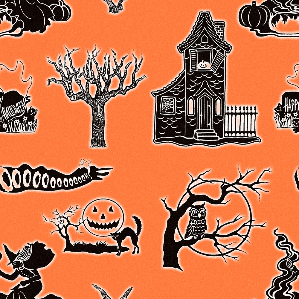 Halloween toile, black vintage-style Halloween illustrations of haunted houses, owls, witches, pumpkins, and barren trees are scattered across a bright orange background with bold white outlines.