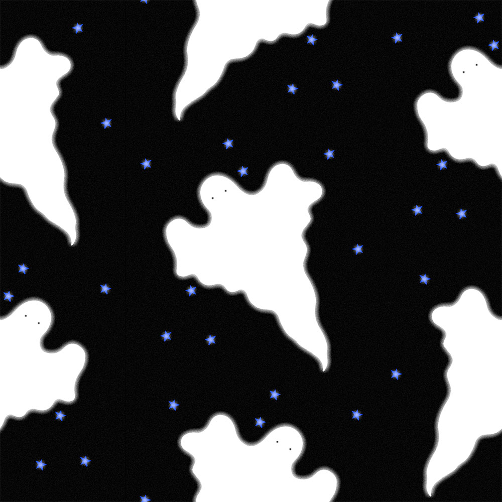 White cartoon ghosts float across a pitch-black background dotted with small glowing blue stars, creating a spooky yet playful night scene.
