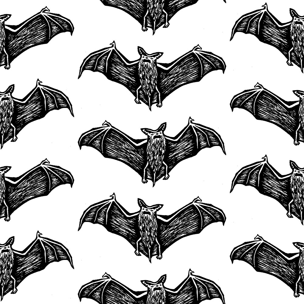 Intricately drawn black bats with outstretched wings repeat across a stark white background, creating a bold and gothic patterned design.