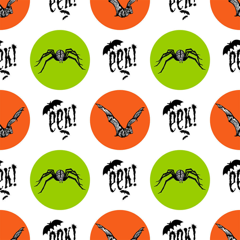A playful Halloween pattern features black bats, spiders, and the word “Eek!” arranged within alternating orange and green circles on a crisp white background.