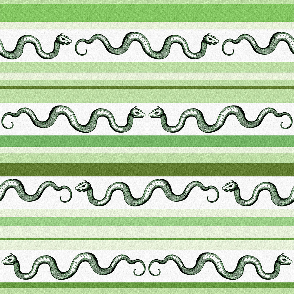 Green serpents (snakes) coil in repeating rows across alternating light and dark green horizontal stripes, creating a bold and textured reptilian pattern.