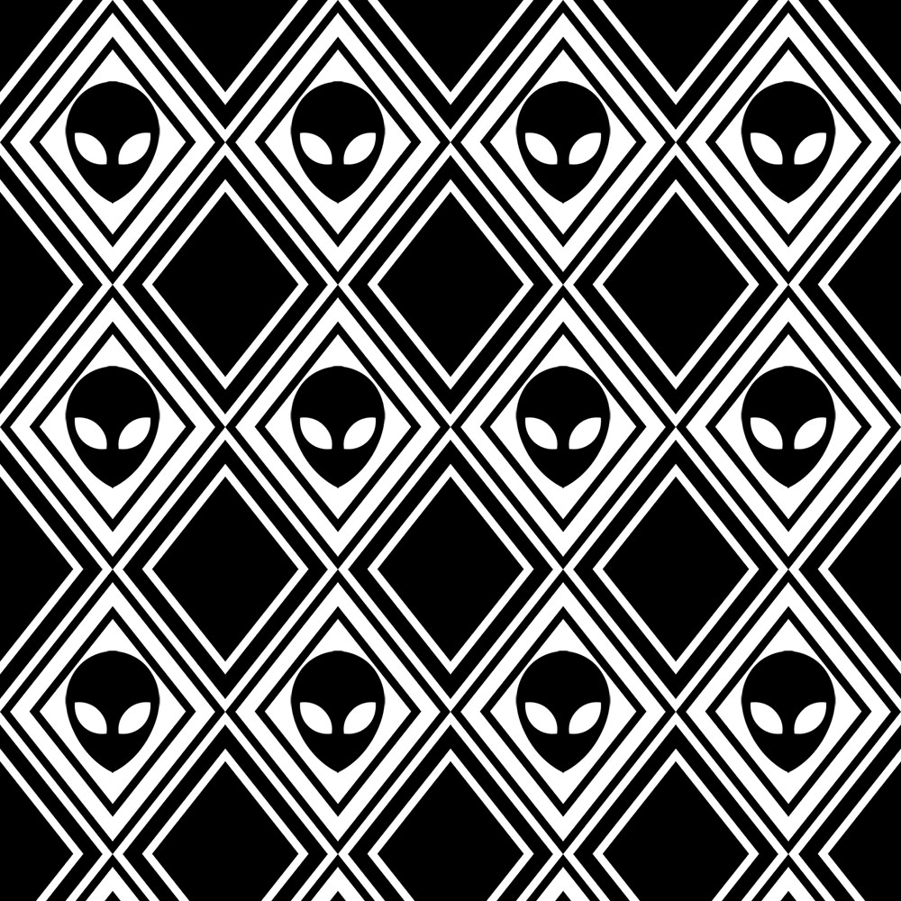A seamless pattern of black alien heads repeats across a grayscale diamond-checkered background, creating a bold and otherworldly geometric design.