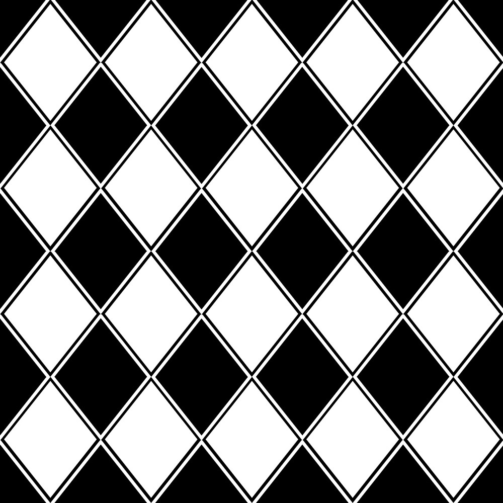 A seamless harlequin pattern alternates between black and white diamond shapes outlined in thin black lines, creating a sharp, high-contrast geometric design.