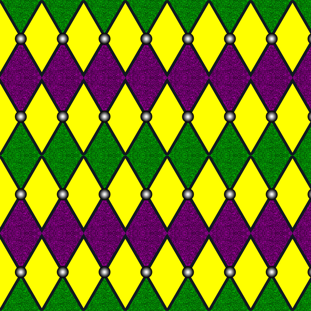 Mardi Gras jester, a vibrant harlequin pattern of alternating yellow, green, and glittery purple diamonds is outlined in black and accented with metallic silver studs at each intersection.