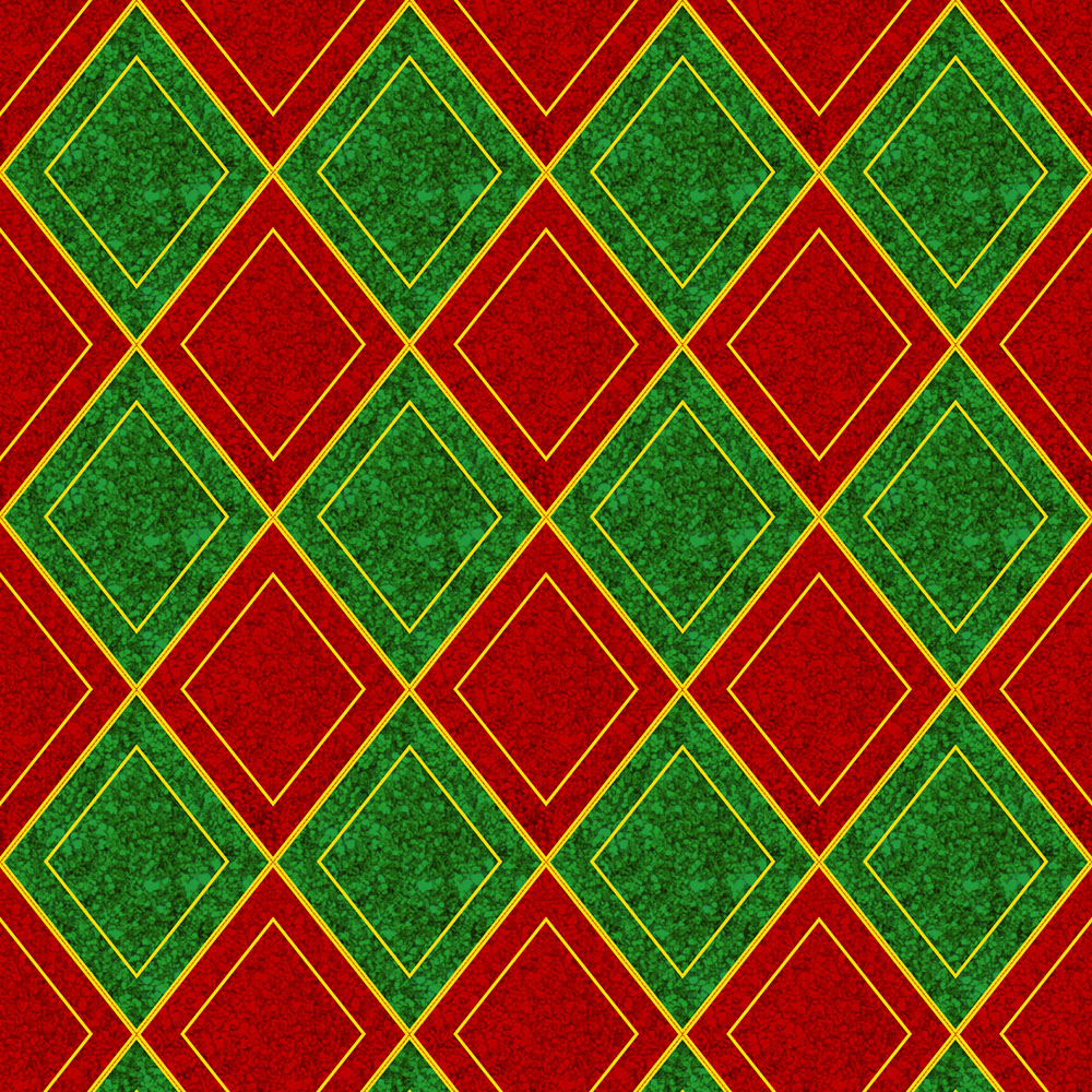 A festive Christmas holiday harlequin pattern alternates between textured green and red diamonds, each outlined with fine golden-yellow borders for a rich, ornamental effect.