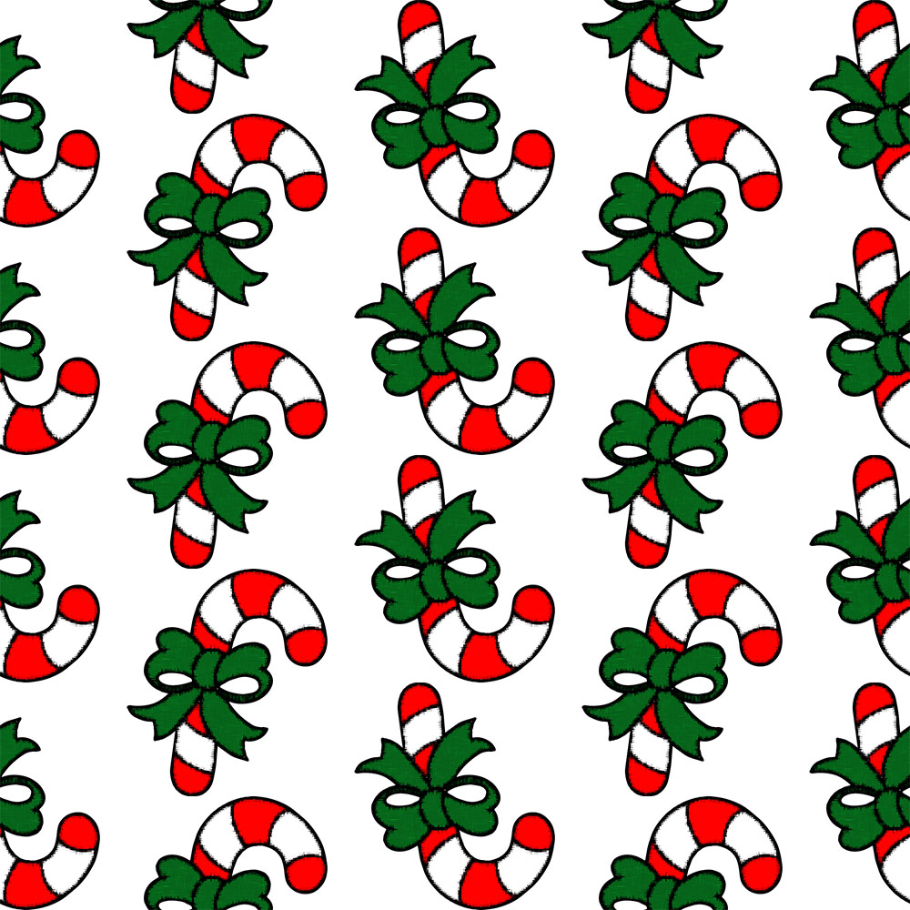 Candy canes with red and white stripes are decorated with large green bows, repeating in a festive diagonal pattern across a white background.
