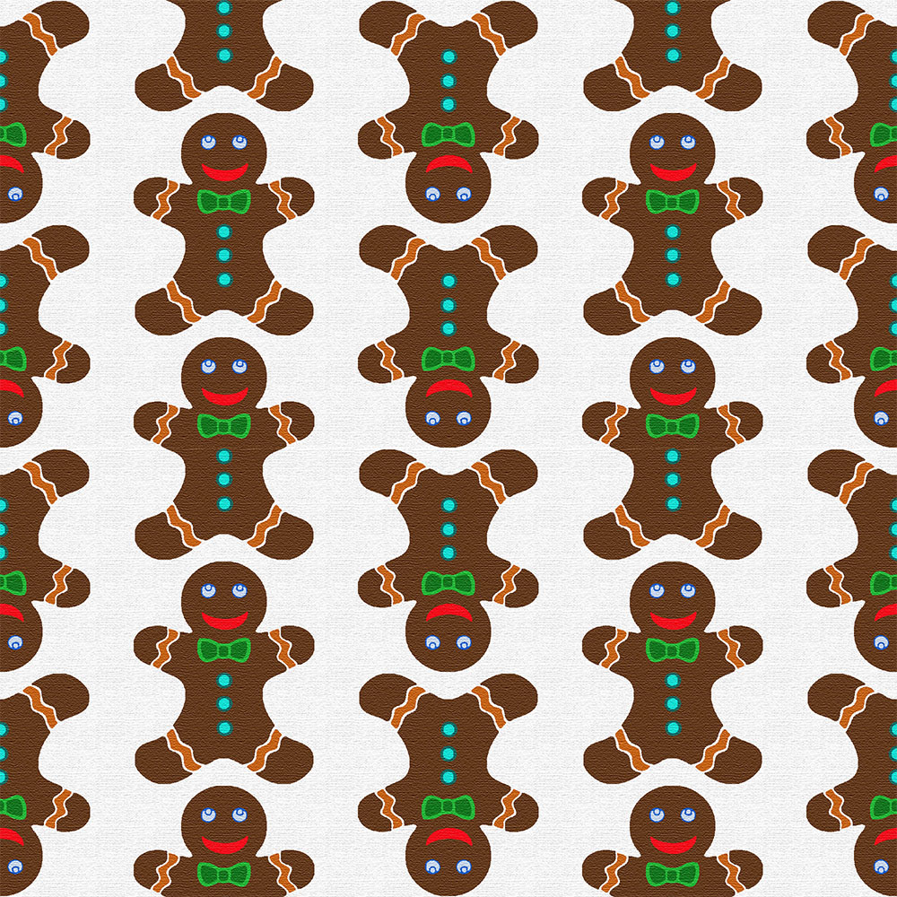 Rows of smiling gingerbread men decorated with green bow ties, blue buttons, and white icing repeat in a festive pattern across a light background.