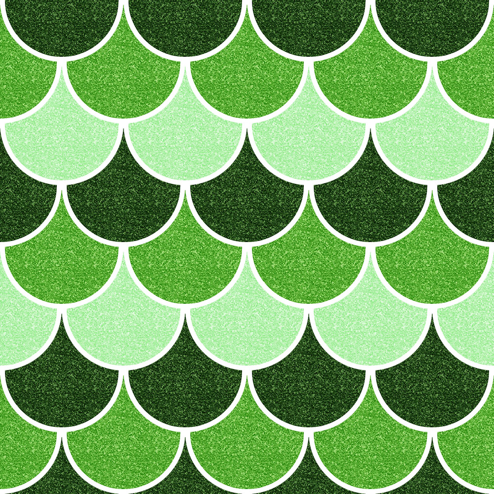 A glittery scalloped pattern alternates in shades of dark green, bright green, and pale mint, outlined in white for a layered, shimmering effect.