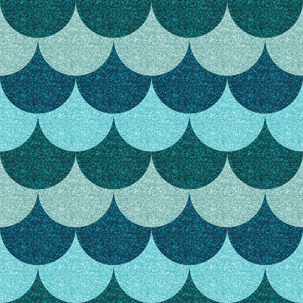 A glittery scalloped pattern alternates in layered shades of teal, turquoise, and aqua, creating a shimmering ocean-inspired design.
