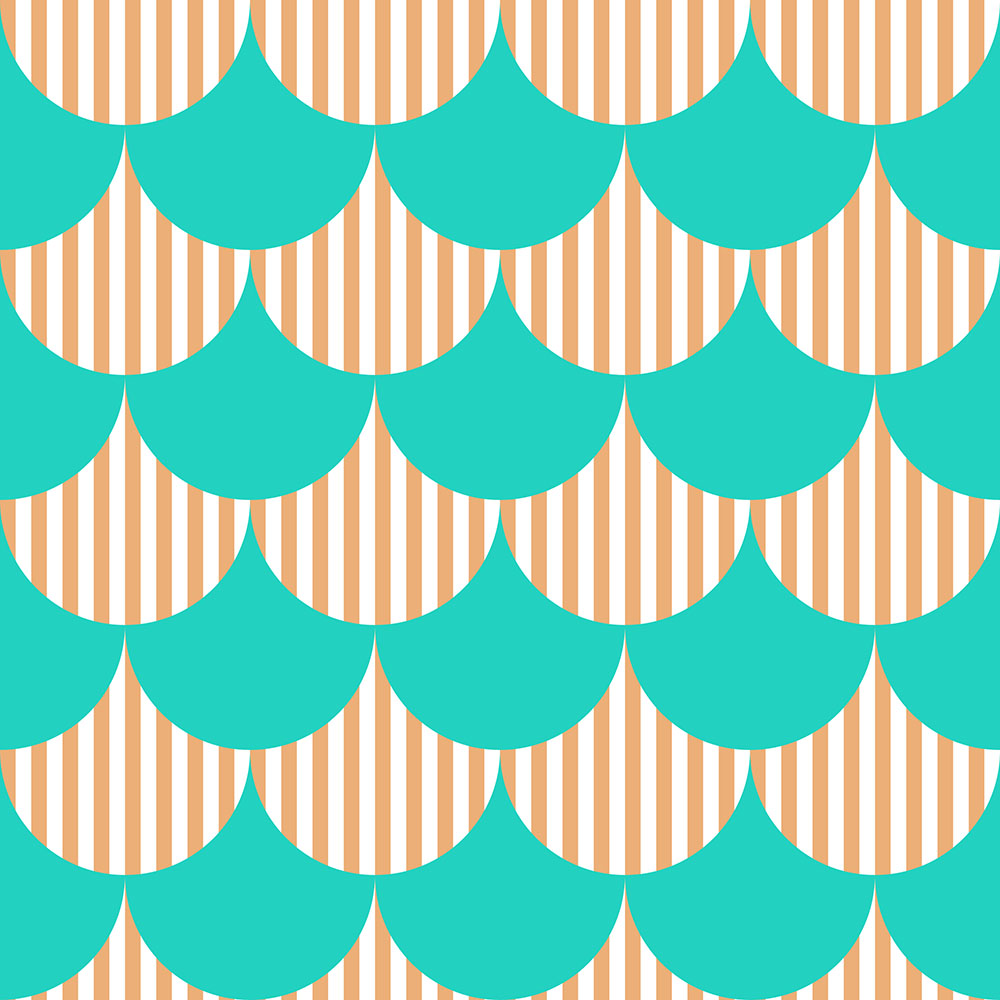 A bold scalloped pattern alternates between solid teal segments and peach-and-white vertical stripes, creating a playful and modern layered design.