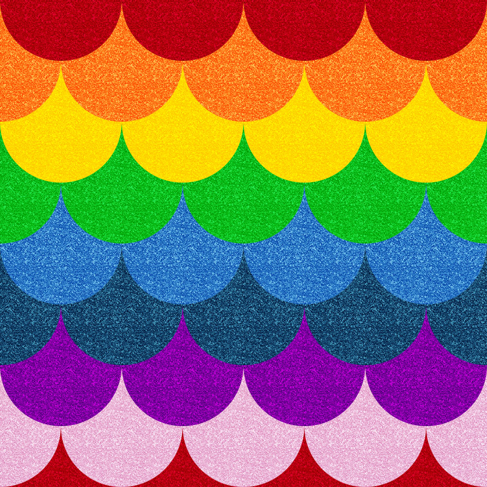 A glittery scalloped pattern cascades in vibrant rainbow hues—red, orange, yellow, green, blue, purple, and pink—creating a dazzling layered effect.
