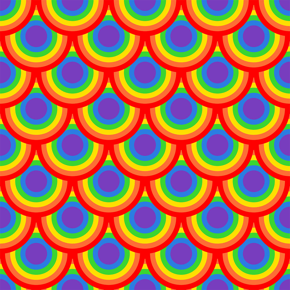 A vibrant repeating pattern of rainbow arches radiates outward from deep blue centers, layered in green, yellow, orange, and red bands against a purple background.