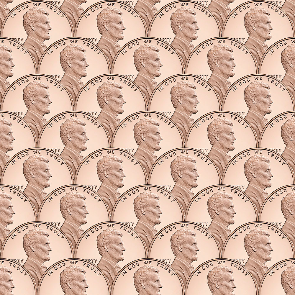A seamless pattern of overlapping U.S. pennies displays the profile of Abraham Lincoln with the inscription "IN GOD WE TRUST" clearly visible on each coin.