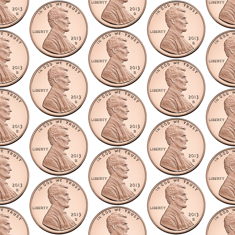 A seamless pattern of overlapping U.S. pennies displays the profile of Abraham Lincoln with the inscription “IN GOD WE TRUST” clearly visible on each coin.